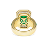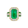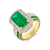 Maximalist luxury at its most refined. This 5.13ct octagonal Zambian emerald takes centre stage, surrounded by an intricate symphony of emerald and diamond cuts that create pure visual drama. Thirty-two square baguette emeralds, fourteen white baguette diamonds, ten princess cuts, and thirty-eight round brilliants totalling 2.92 cts work in perfect harmony across 18k yellow gold. This isn't just a ring – it's a masterclass in how to make every surface count.